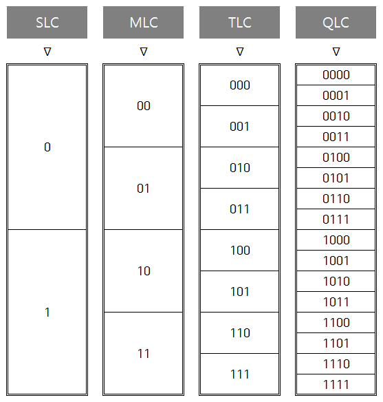 하나의 셀에 0또는 1이 데이터로 저장되는 의미를 말하며, QLC는 4자리, TLC는 3자리, MLC는 2자리, SLC는 1자리로 표기한다. 하지만 전반적으로 QLC 방식은 저장 능력에는 좋지만 많은 단계를 거쳐야 하고 복잡한 처리 과정이 생기므로 성능에서 차이가 난다. 성능과 수명, 가격 등으로 볼 때 MLC 방식이 보편화 되어 있고 가장 많이 사용한다.
